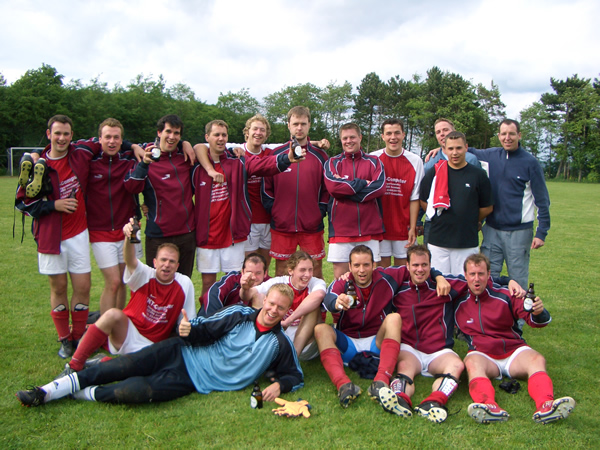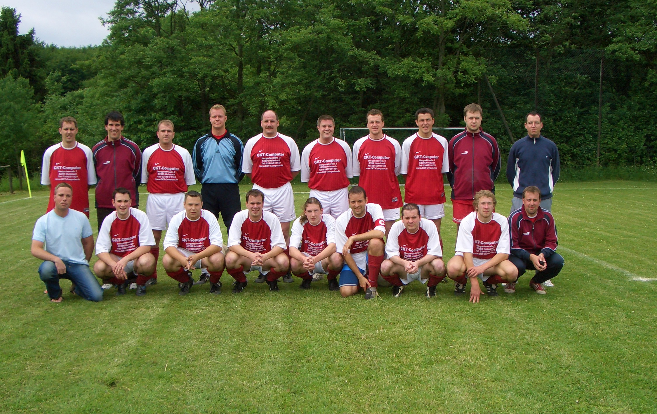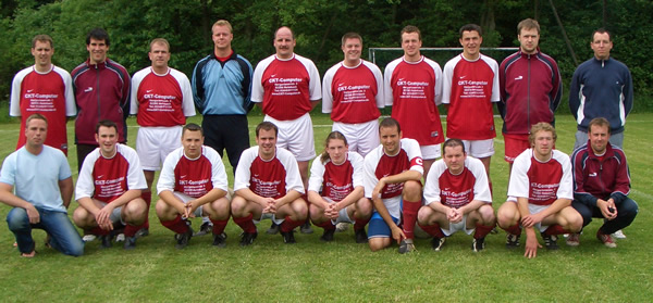 | Hier ein Mannschaftsfoto der Saison 2004/2005 vor und nach dem grandiosen Aufstiegsspiel gegen Cicero Kalkar am 05.06.2005. |